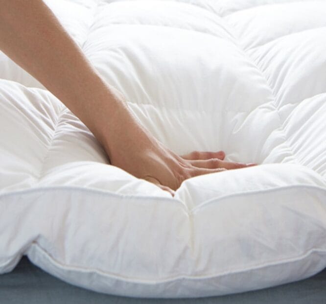 تصميم خياطة مربعات (Baffle Box): يضمن هذا التصميم الذكي توزيع الحشوة الداخلية بالتساوي ويمنعها من التكتل أو التحرك أثناء النوم، مما يوفر دعمًا متناسقًا طوال الليل.